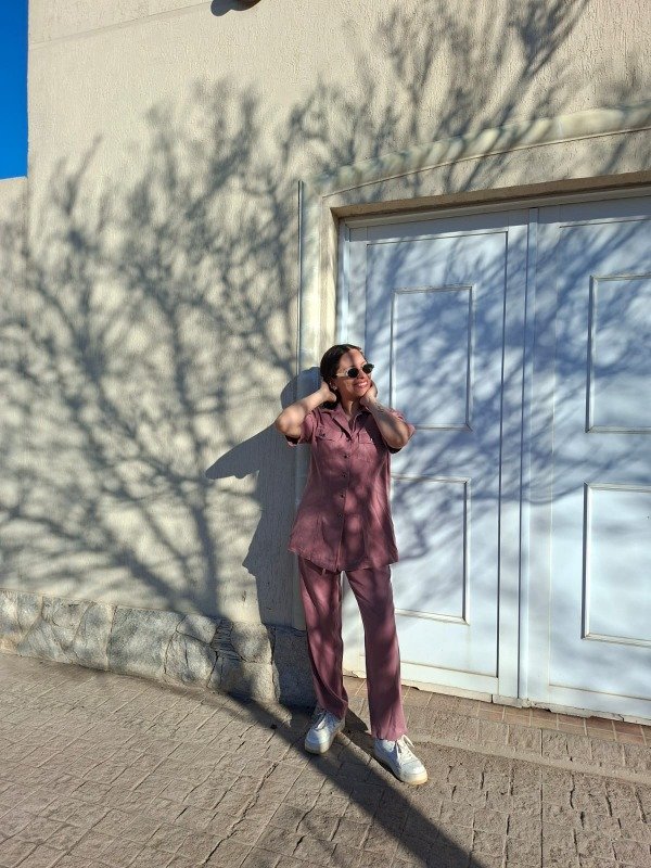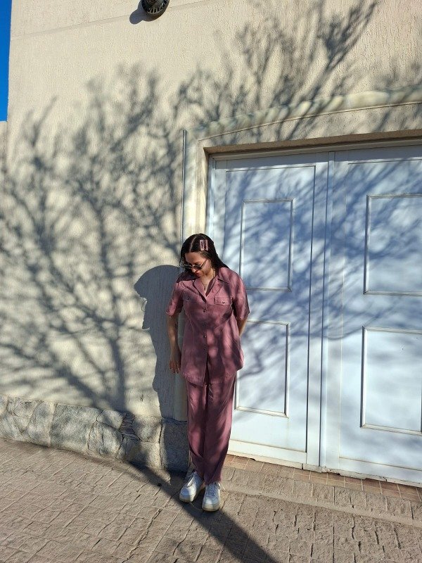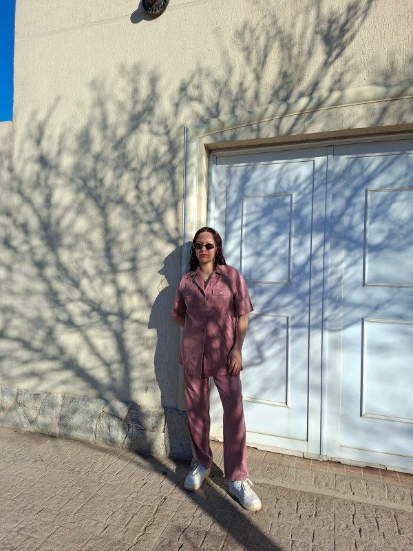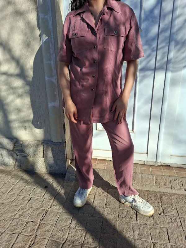 Conjunto color rosa viejo. Set de dos piezas. Pantalon largo corte recto tiro alto con cierre y pasa cinto. Solera manga corta con bolsillos y botones. Entallado. Marca Waly. Etiqueta talle 42.
