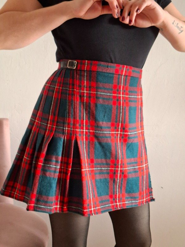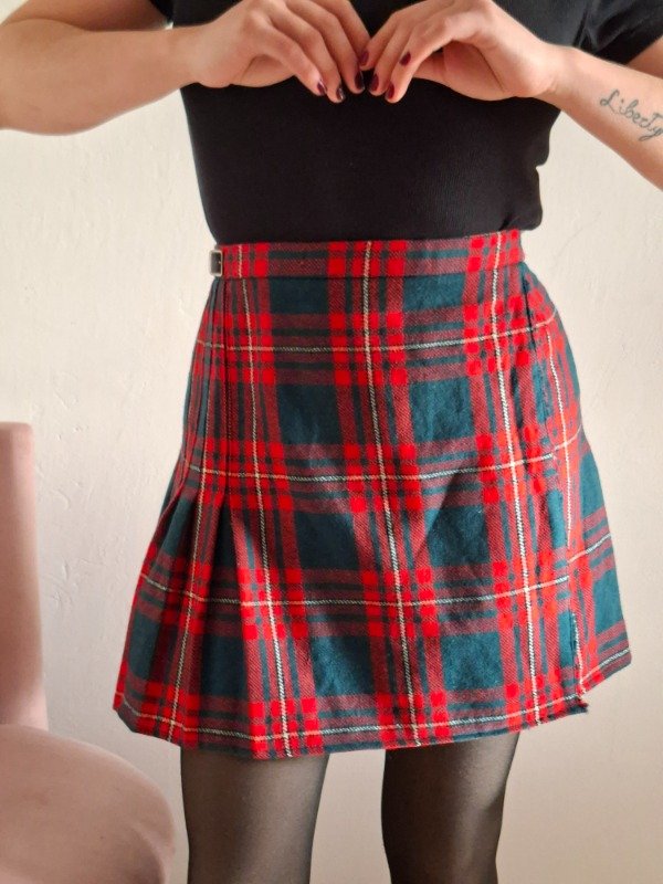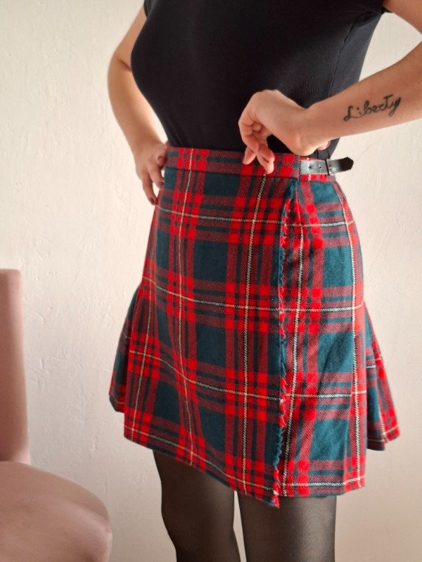 Pollera escocesa color roja combinada con azul. Marca Pure mew wool. Etiqueta talle 10. Tela gruesa. Paño. Intervenida, cortada a medida.
