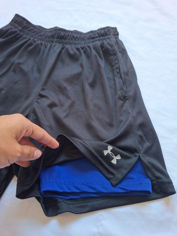 Short con calza under armour con bolsillos color negro con azul. Etiqueta talle S. Con elastico en la cintura. Tela fresca.