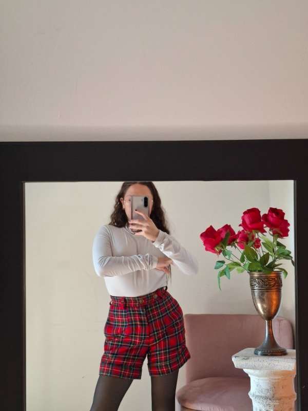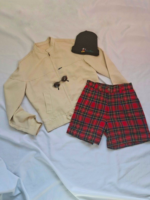 Marca Fenzil Naval. Etiqueta talle M. Color rojo de paño grueso cuadrille con colores. Tiene dobles en su terminación. Con cierre metalico color dorado y botón originales. Con pasacinto.