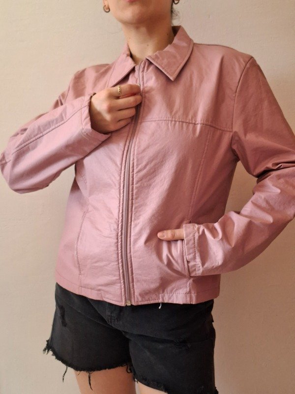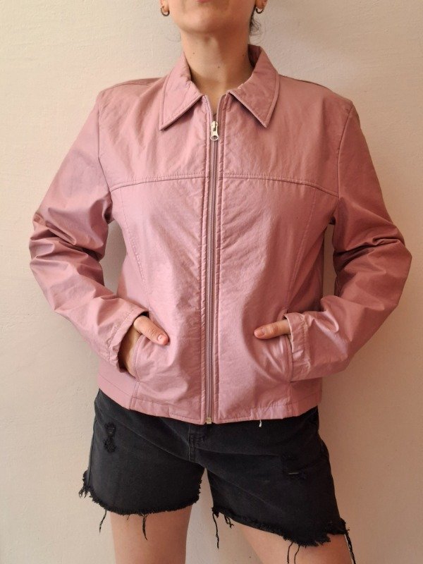 Chaqueta de cuerina color rosa viejo, con bolsillos y cierre. Marca Sinavro. Etiqueta talle 4.