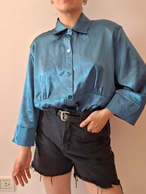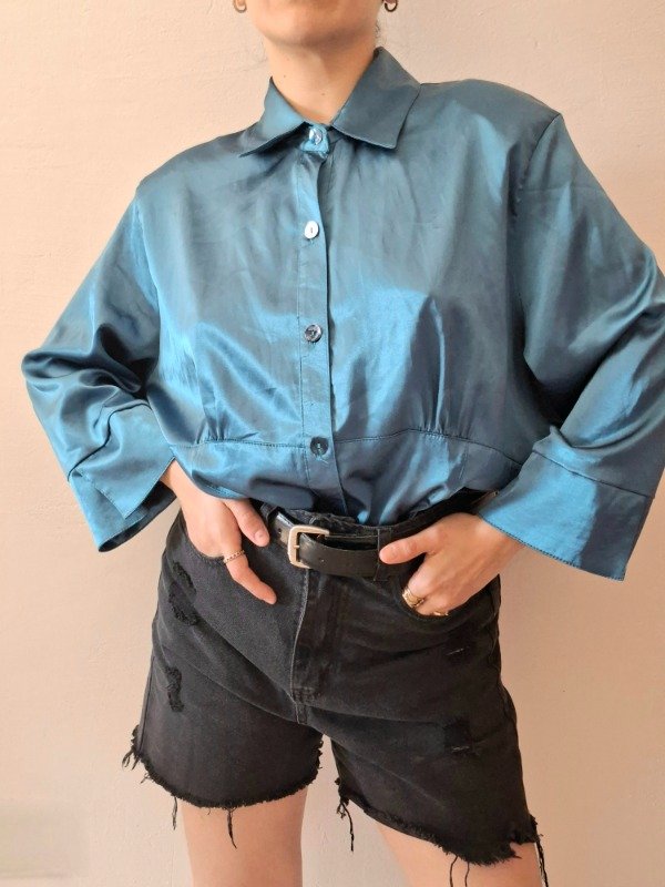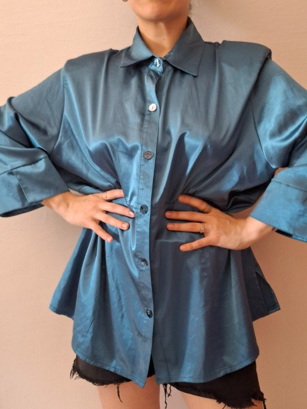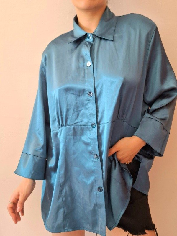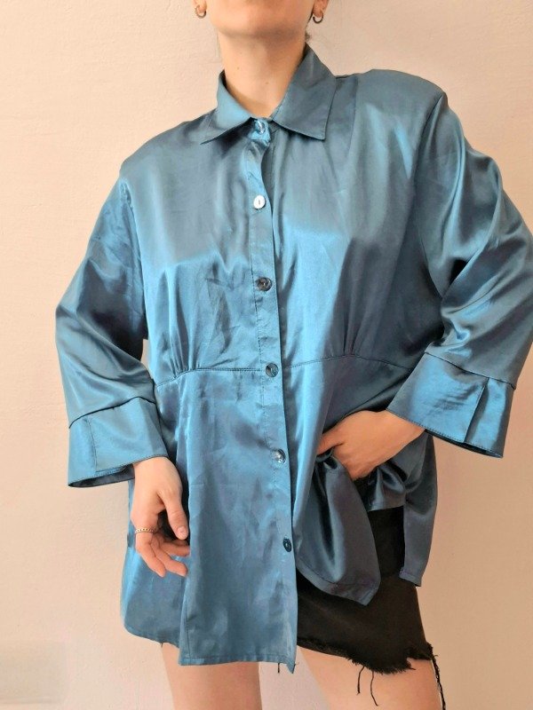 Camisola color petroleo, manga 3/4, con botones, de seda. Tela brillosa y suave. Cocn hombreras.