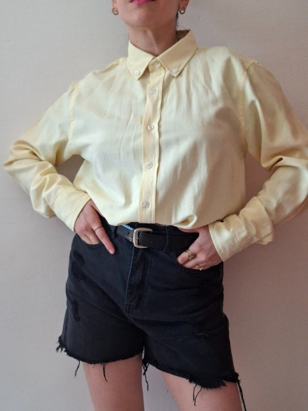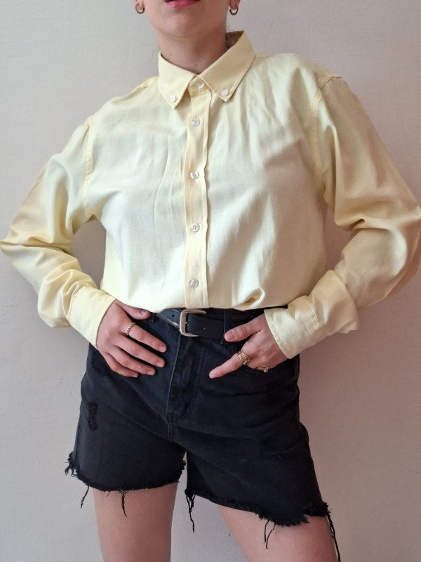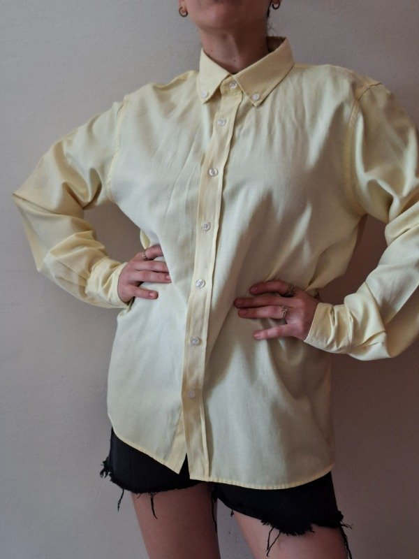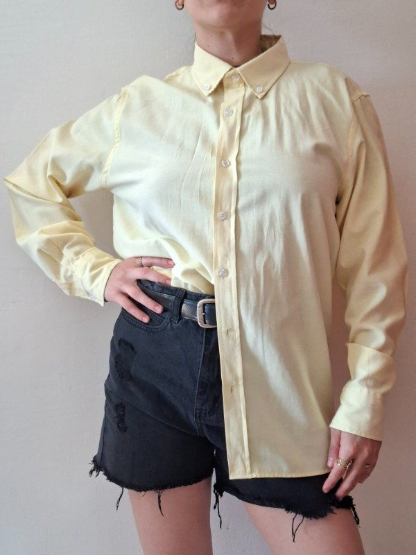 Camisa de vestir de color amarillo claro con cuello de botones y puños de un solo botón. Marca George. Etiqueta talle S. Tela fresca y liviana.