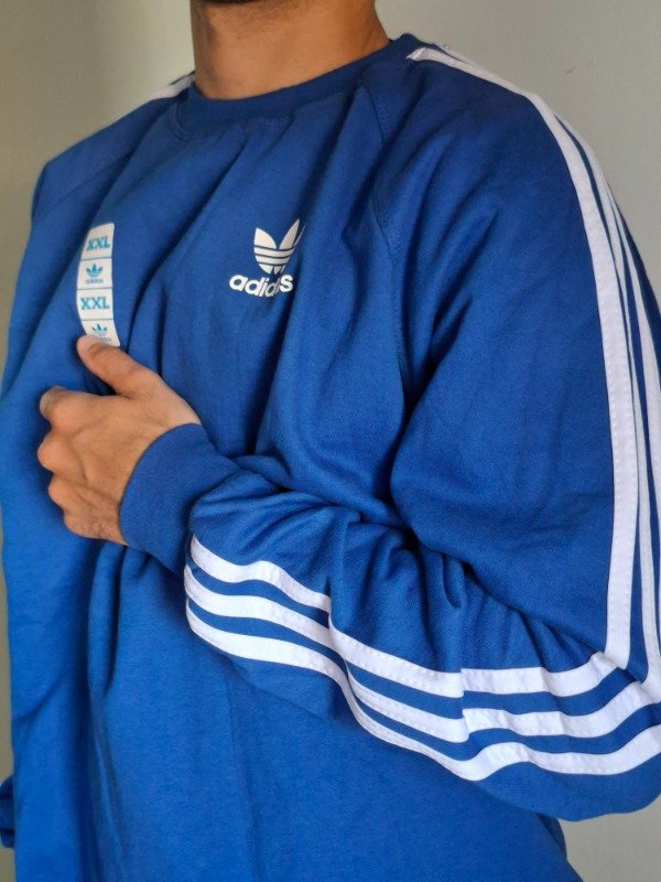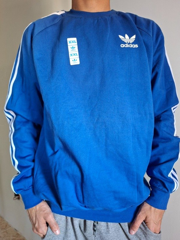 Buzo adidas, frizado, de algodón. Color azul, manga larga. Etiqueta talle XXL. Con logo en el pecho y tiras.