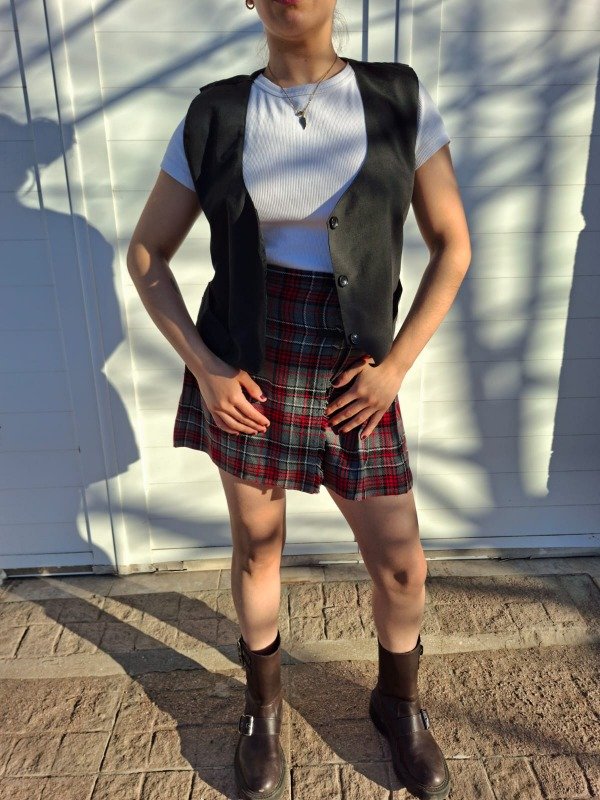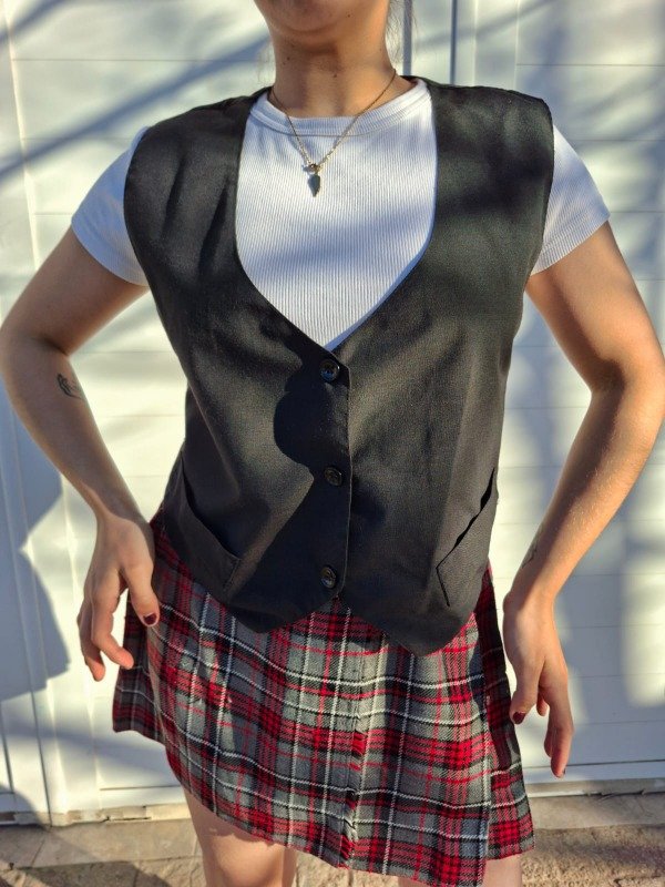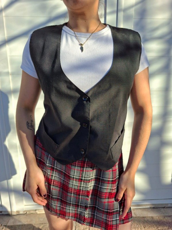 Chaleco color negro de sastreria, con simulación de bolsillos y botones. Tiene para atar en la parte de atrás.