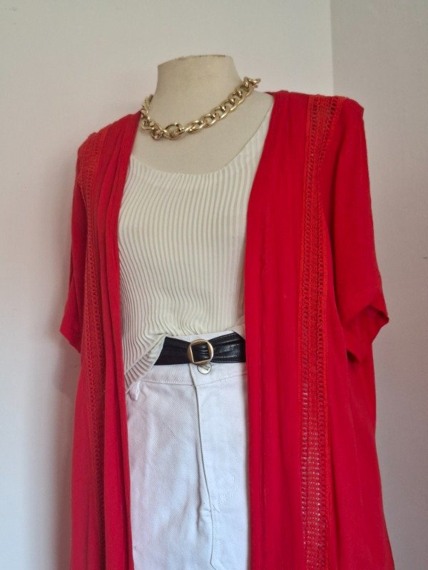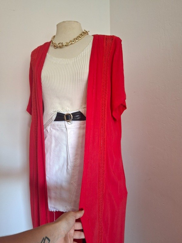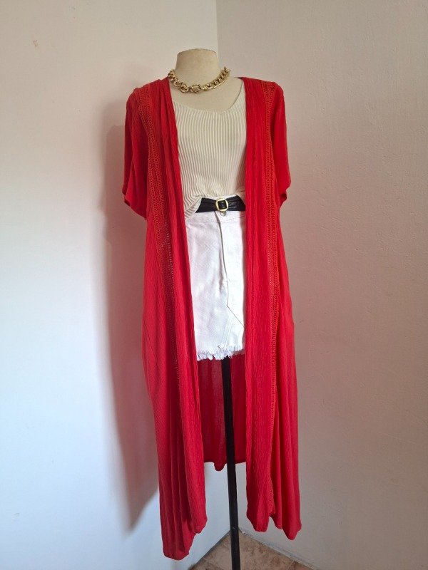 Kimono color rojo con banguardias. Largo y manga corta. Tela fresca de gasa o lino liviana. Etiqueta talle 6.