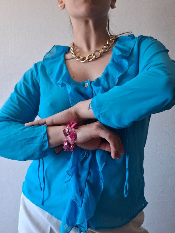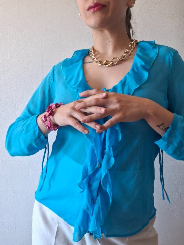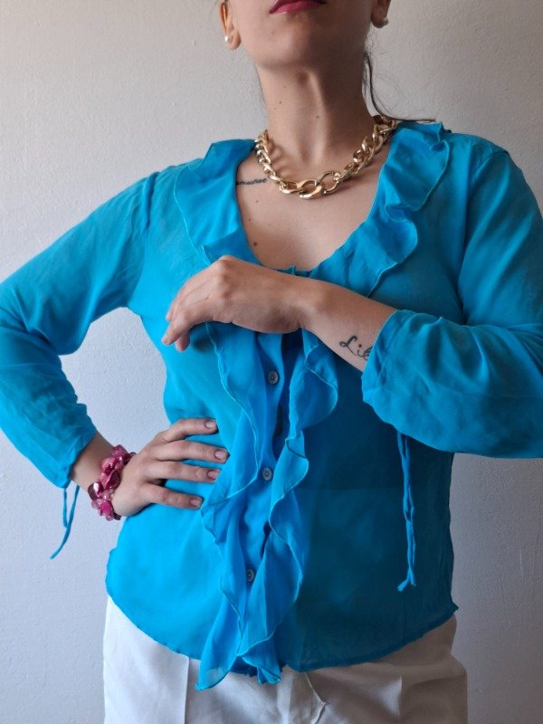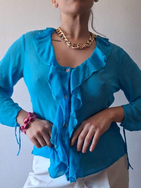 Blusa de gasa color celeste con volados, frunce en las muñecas. Tiene botones, escote en v. Traslúcida.