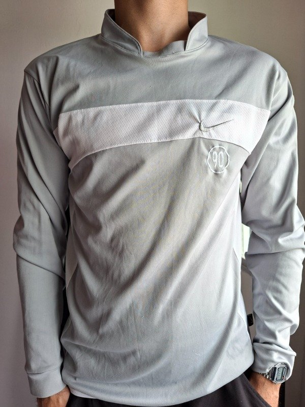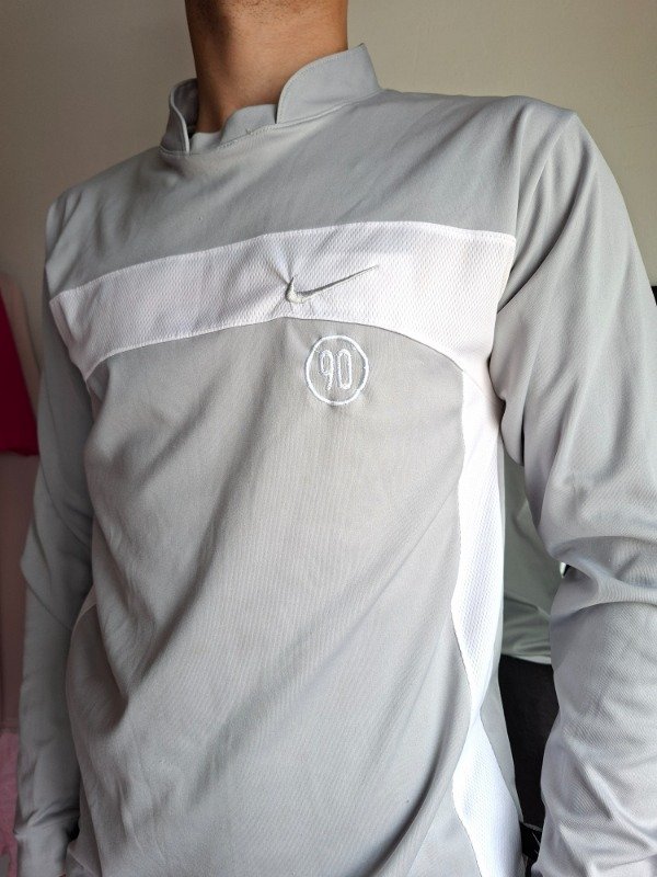 Remera deportiva color gris combinada con blanco. Marca nike. Cuello redondo. Manga larga. Con puño. Talle M