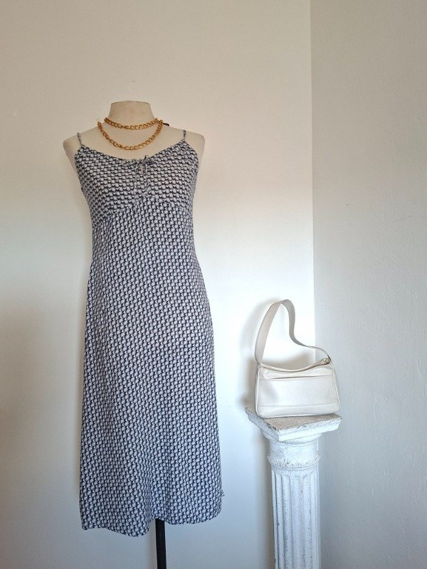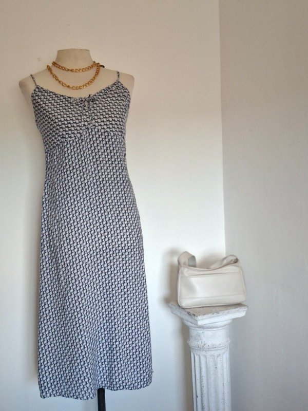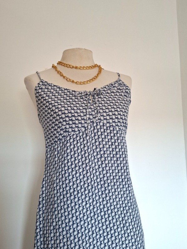 Vestido de tirantes con un estampado de patrón geométrico en azul marino y blanco. Se ata en el pecho, largo hasta las rodillas, tiene cierre en la parte de atrás.