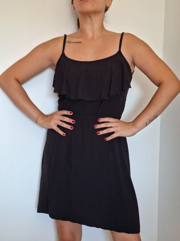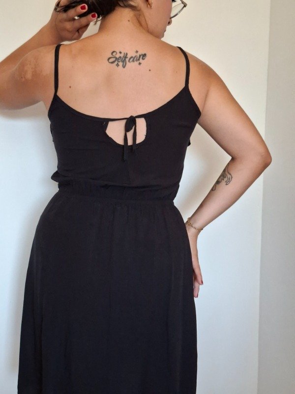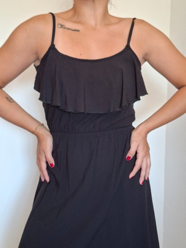 Vestido de fibrana color negro. Tela liviana y fresca. Con volado en el pecho. Tiene para atar en la parte de atrás y elástico en la cintura.