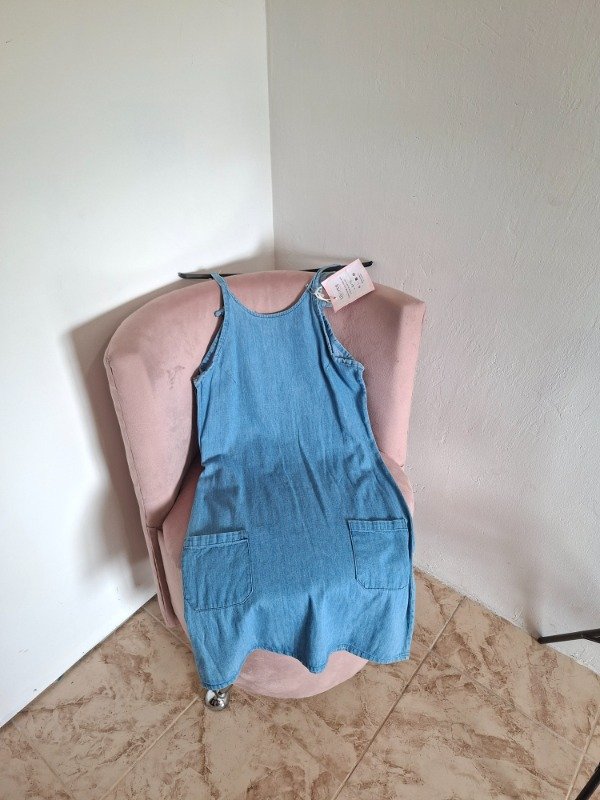 Vestido de jean rígido color celeste. Con cierre al costado. Tiene tiras. Con bolsillos.