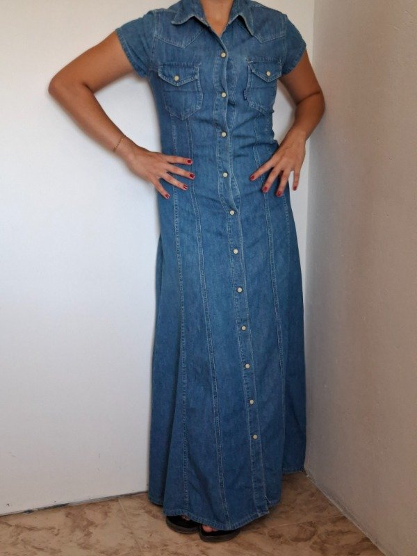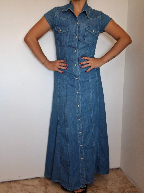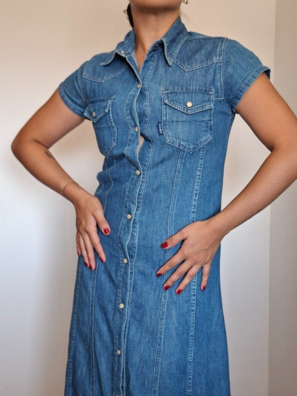 Vestido de jean color azul rígido. Manga corta con cuello. Entallado en la cintura. Tiene bolsillos delanteros. Botones a presión. Etiqueta talle S. Marca GVNY jeans