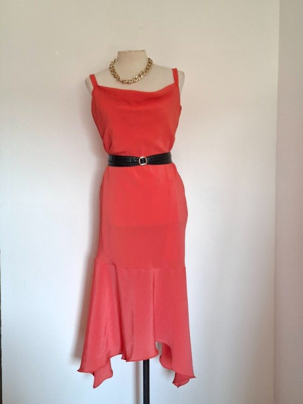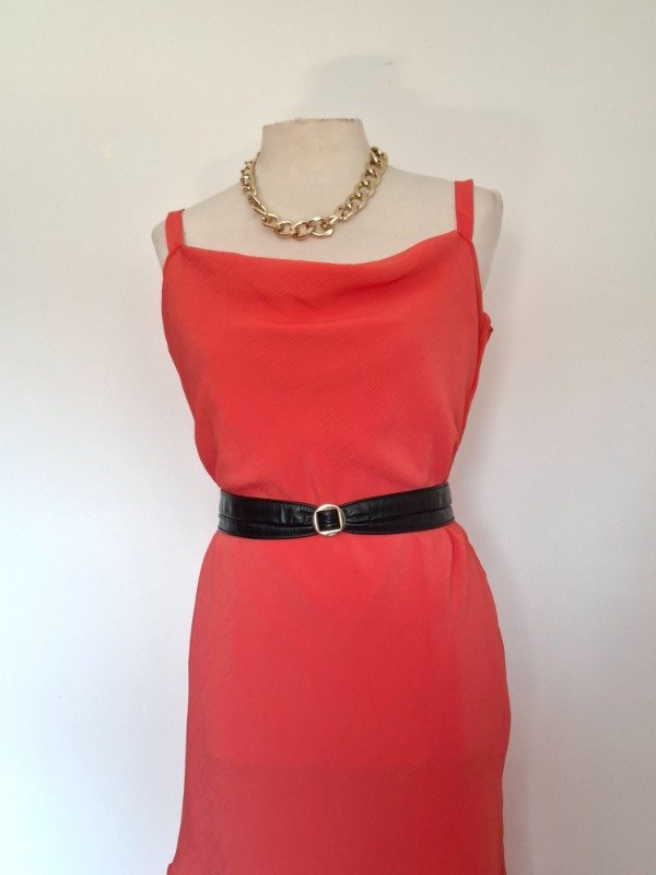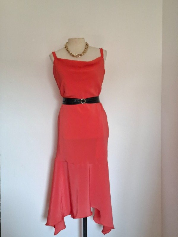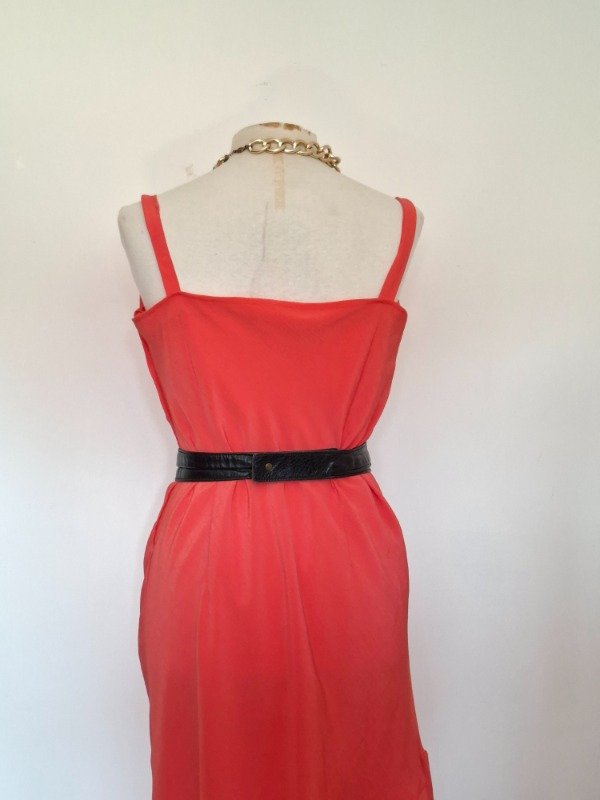Vestido de fiesta. En color orange, con tiras y cuello buche. Con cierre al costado. Entallado. Forrado en la parte interior.