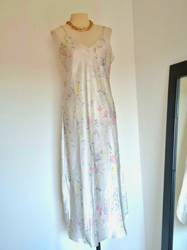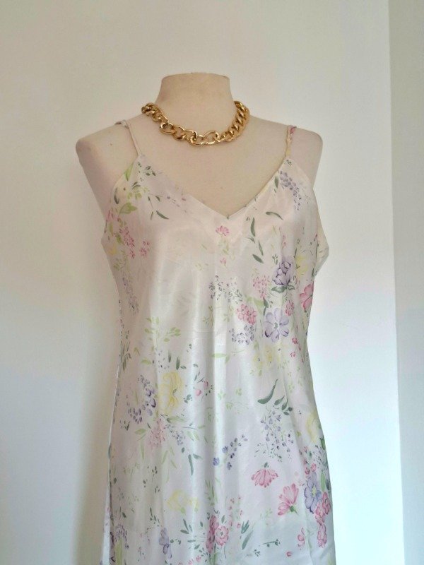 Vestido color blanco de seda con tiras regulables, escote en v. Con dibujos en flores. Con tajos en las terminaciones. Marca Nataly W. Etiqueta talle L.