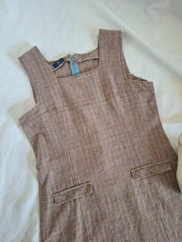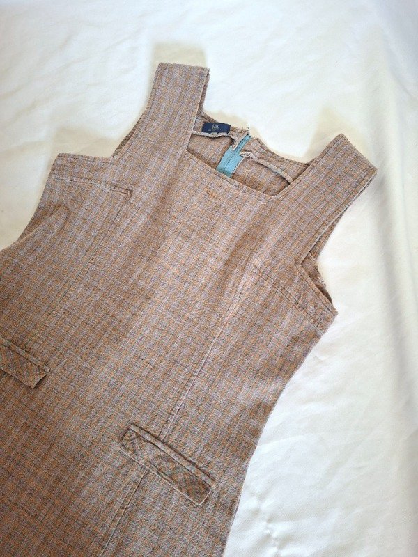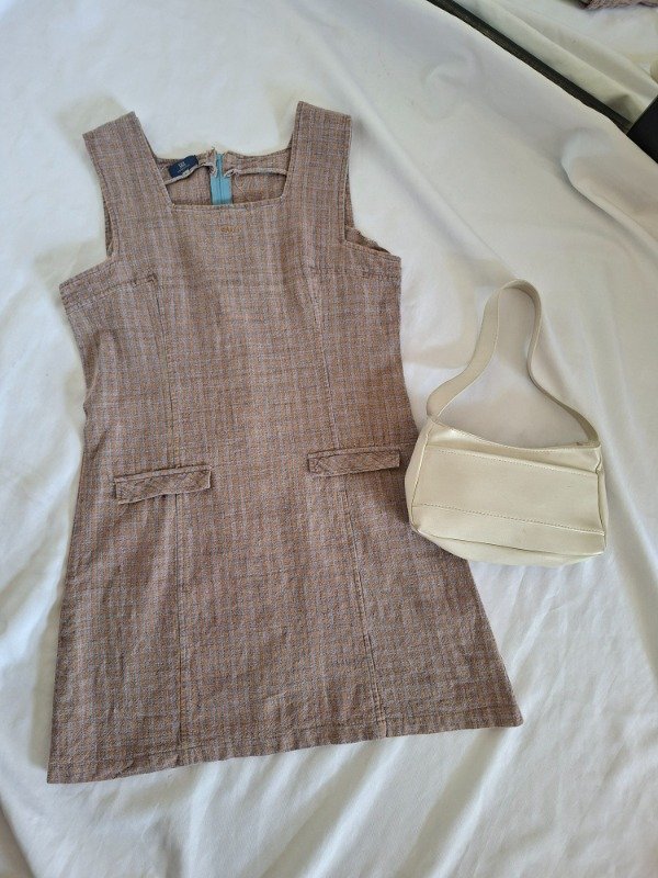 Vestido color violeta con diferentes colores, de lino a rayas con bolsillos de parche frontales. Tiene cierre y agarre en la parte de atrás. Escote cuadrado. Marca SAIL. Etiqueta talle L
